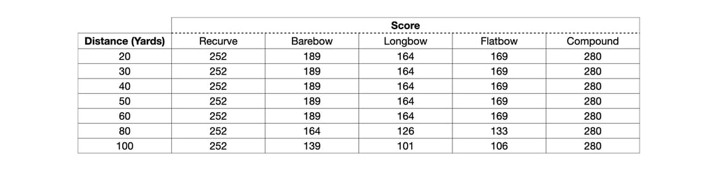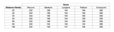 While it's called a '252 Scheme', the scores actually vary depending on the distance and the type of bow you're shooting.