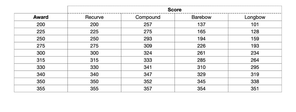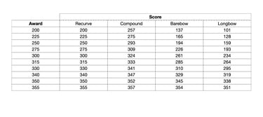 The scoresheet must be submitted to the club and witnessed by another archer, and in a similar fashion to the '252 Scheme', the actual 'score' varies depending on the type of bow being used.